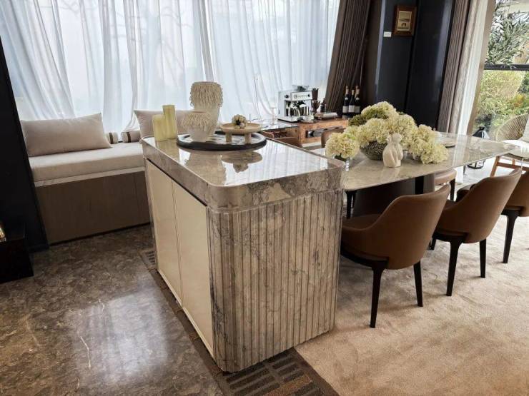 值得一提的是,厨房还配置有大金的厨房专用空调,另外价值3万左右的卡幕白石材中岛台同样也是交付标准!