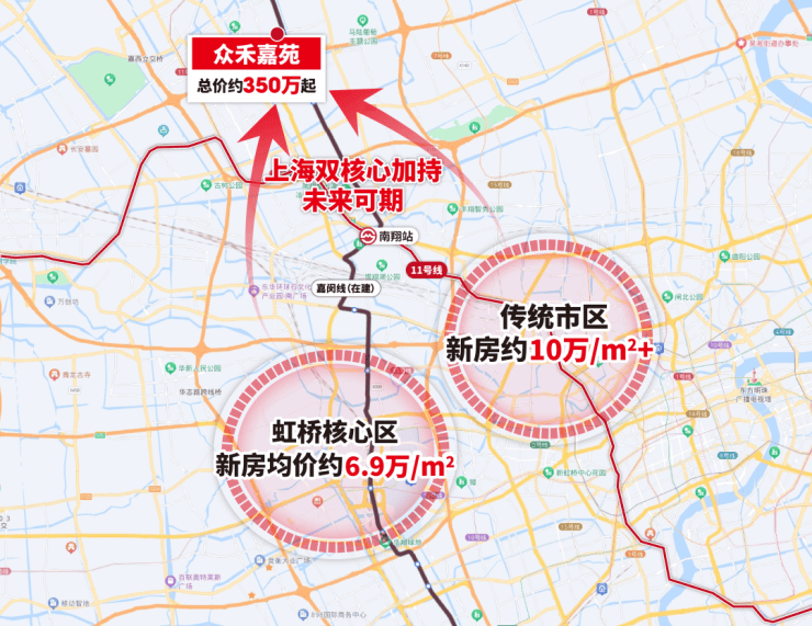 同时,嘉闵线目前沿线新盘均价在6-8万/㎡,相比之下总价约350万起的众禾嘉苑洼地属性明显,未来必然能持续的从虹桥、市区两大中心导入人口,经久不衰!
