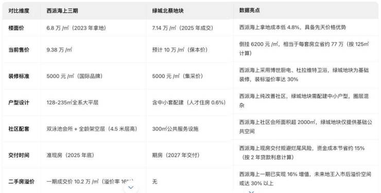 上述表格可见,绿城北蔡地块楼面价71412元/㎡+装修成本5000元/㎡(集采价)+配建成本,保本售价需10万以上/㎡,西派海上三期当前售价9.38万/㎡,与新地王直接倒挂6200元/㎡。