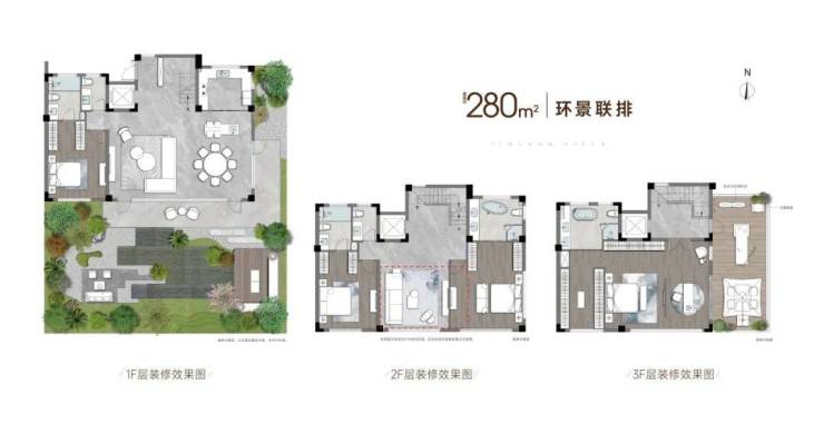 我们来重点看看几款经典的联排户型: 建面约280㎡的环景联排,格局非常豪横。拥有超大的横厅、阔绰的庭院和星空露台,生活空间跨层联动,气场十足,绝对是改善家庭的“心头好”。这种大联排别墅设计,充分满足了高端居住的尺度感。