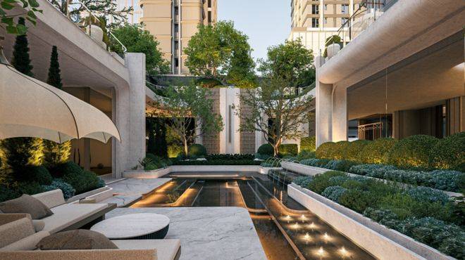 下沉式庭院会所更是集功能性与美学于一体,中央水景、休闲坐席与健身区、恒温泳池等,既满足业主的运动需求,也为社交聚会提供了优雅场所。