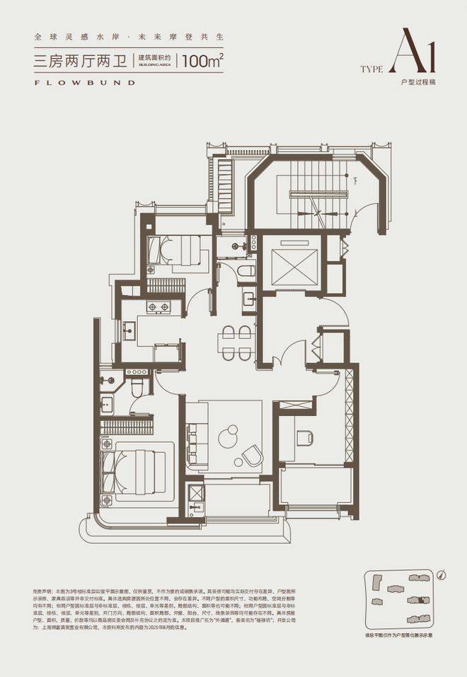 南向双主套均配备独立卫浴与全景飘窗,主卧卫浴更是采用“双台盆+浴缸+淋浴区”的三段式布局,媲美五星级酒店;
