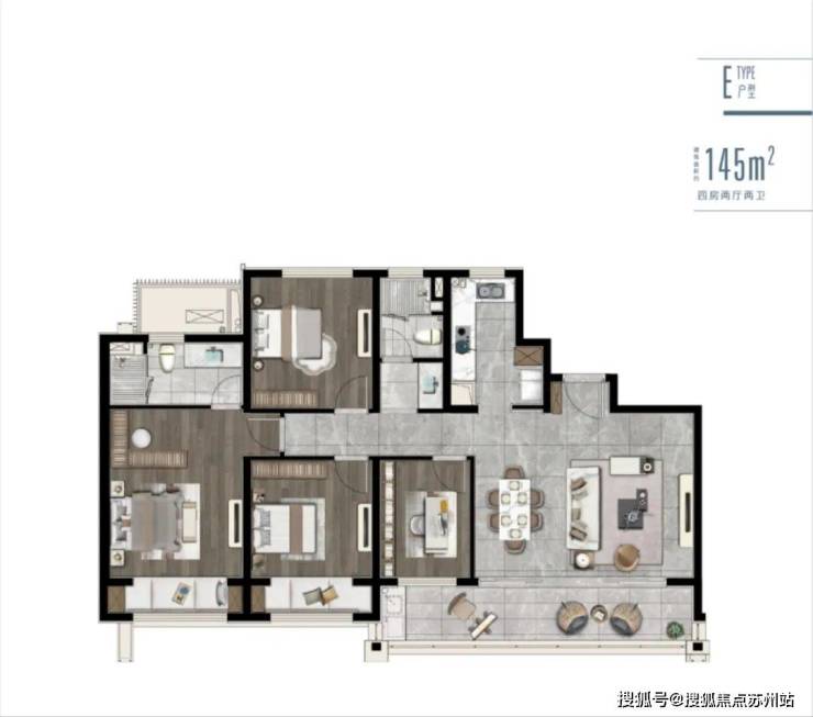 方正户型:全明通透,3+1开间朝南,轻松拥揽四季景致;