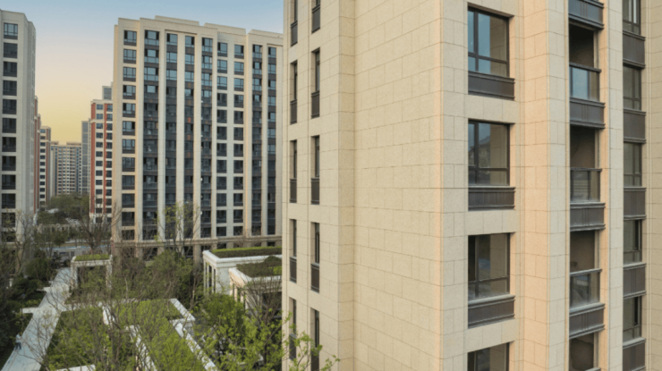 这次项目外立面质感很特别,采用浅色系全石材干挂,巴西都伯斯金麻、宏宇金麻搭配铝板线条,看盘当天天气不错,在阳光照耀下,立面闪烁着温润光泽。