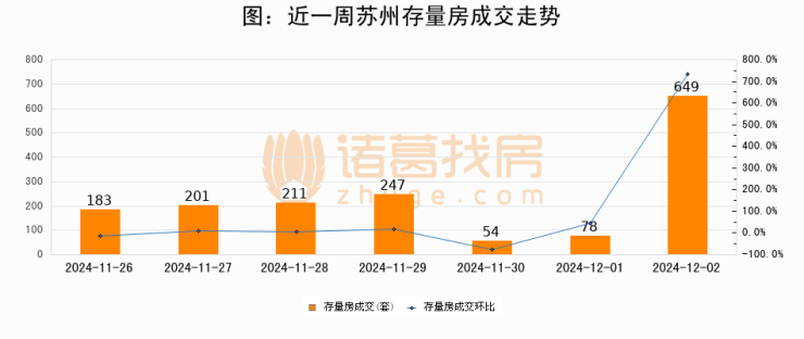 从存量房来看,2024年12月02日苏州存量房单日成交649套,比昨日增加571套,环比上涨732%。从近一周存量房成交来看,苏州存量房日均成交套数为231套,12月02日单日成交649套,高于近一周平均水平181%。