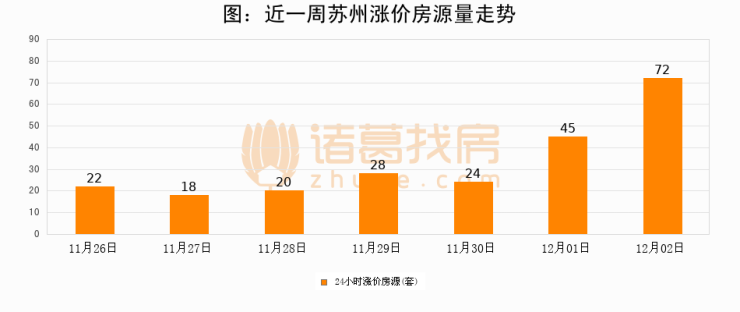 根据诸葛找房数据显示,苏州24小时涨价房源量为72套,较12月01日增加27套,环比上涨60%。与此同时,涨价房源占比小幅扩大,业主信心有所提升。