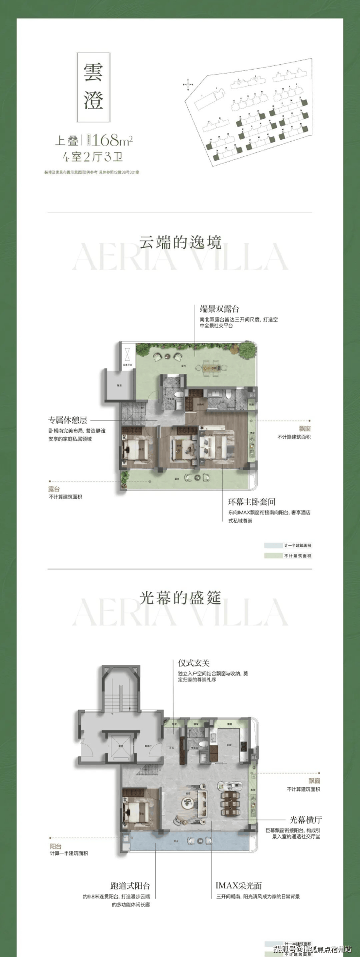 约168㎡上叠;这个户型同样独立电梯厅,但是三面宽设计,南向三阳台空间并列.