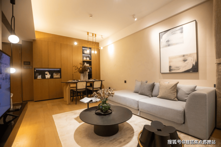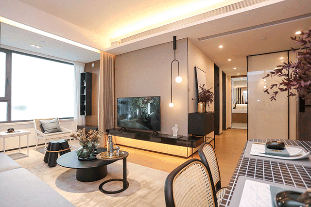 The spacious living room is connected to a balcony with a view. The natural texture of the city comes into view, bringing the scenery into the room and allowing the indoor and outdoor Spaces to flow naturally.