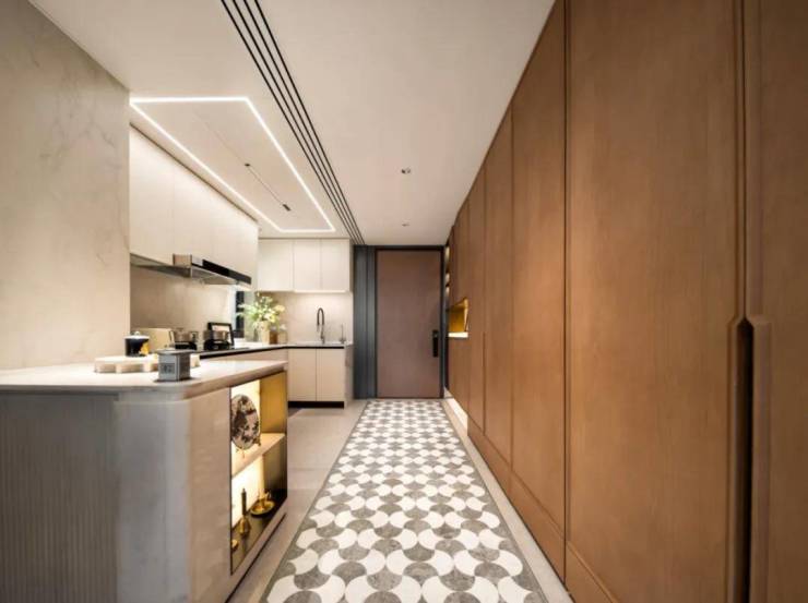 这是一个非常巧妙的设计,比如将冰箱塞入这个凹槽,从而释放厨房的冰箱空间,延伸灶台的面积,或者可以做岛台...