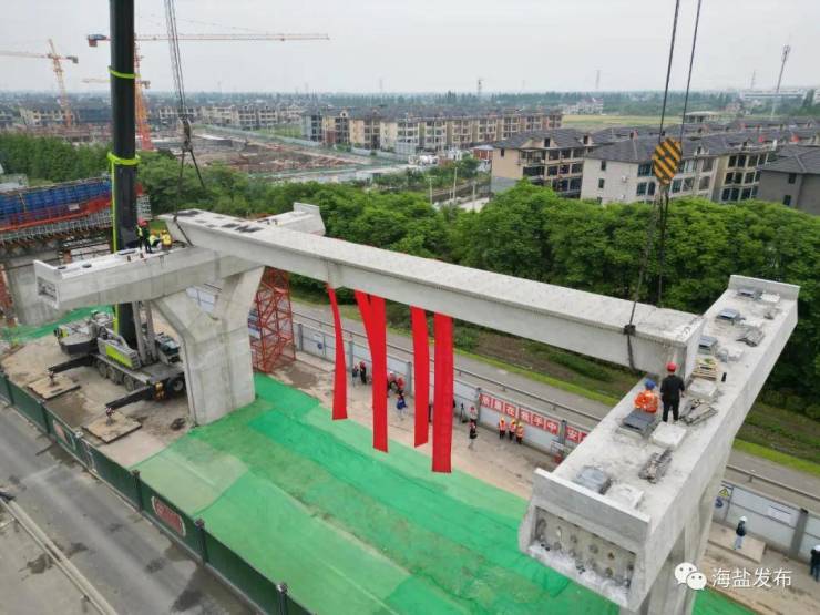 就在5月12日,“一环11射”里的海盐射线,迎来突破性进展——成功架设首片混凝土箱梁,正式进入上部结构现场施工阶段!