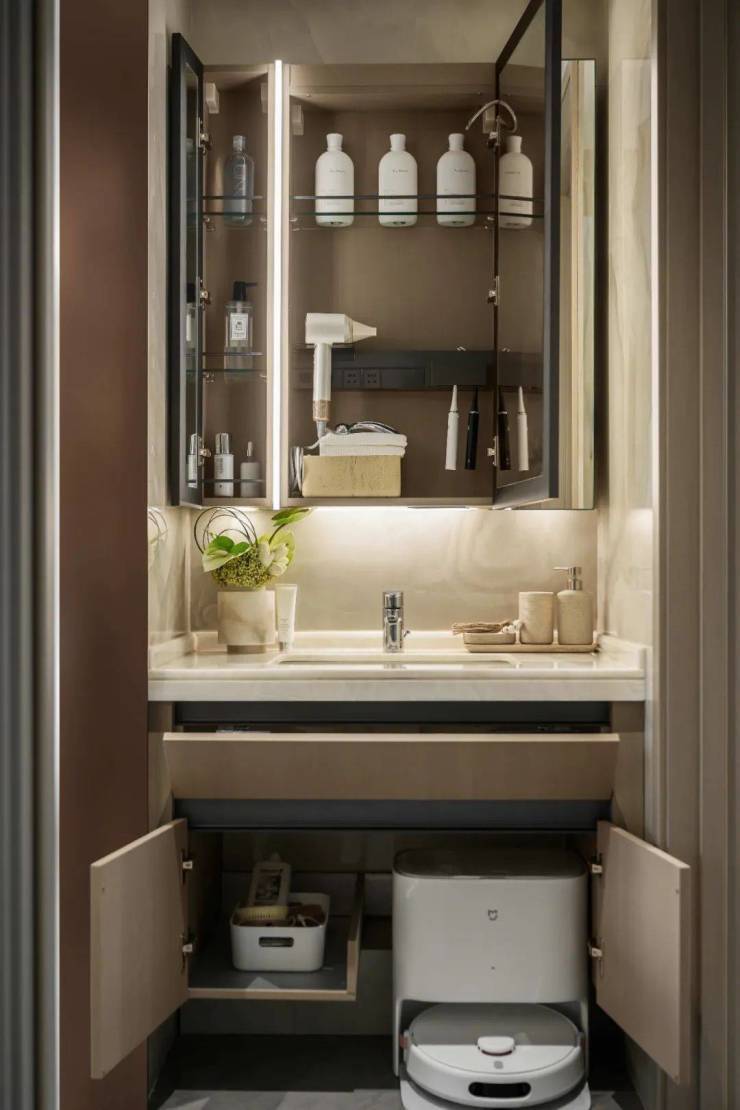 并且在台盆下方做了袋鼠抽柜体,下方预留扫地机器人充电点位,比起传统的抽拉柜体更实在。