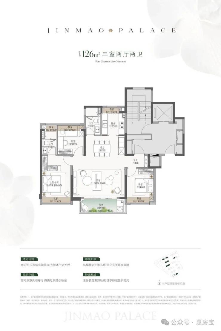 多飘窗设计进一步提升使用率,样板间利用北卧飘窗铺就舒适榻榻米;厨房也有飘窗,增加了操作台面和收纳。建面约126㎡3房:南向三开间约12米面宽,其中宽厅面宽达约5.9米,二胎共同玩耍都绰绰有余;