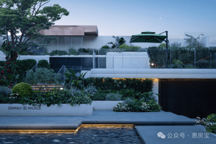 蓝翡翠水景围着下沉庭院,中间有蜿蜒的挑台连着瀑布,顶层还有供业主小聚的女王花厅,实现了美感与功能的完美融合。这种立体折叠景观,唯有鼎流豪宅社区才具备,比如今年19.5万/㎡的绿城潮鸣东方。而江湾金茂府,将这般独特体验搬到了业主楼下!这是区域内真正「人无我有」的前瞻性构思,比起单纯的卷装标和卷石材,这才是一个社区真正独特且具有标识度的元素,也是身份感的象征!