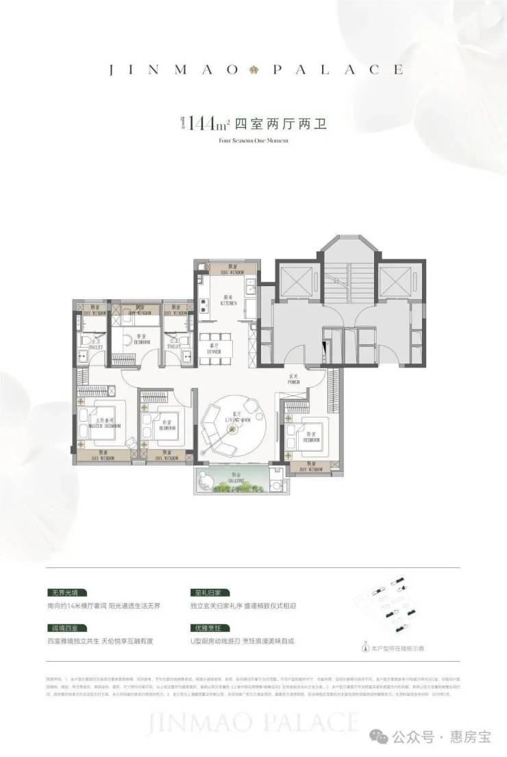 全屋五飘窗,且像主卧,飘窗满面宽,实用性很强,总面积超过7㎡,堪比常规三房户型的次卧了!建面约144㎡4房:类一梯一户设计,电梯厅私密入户;