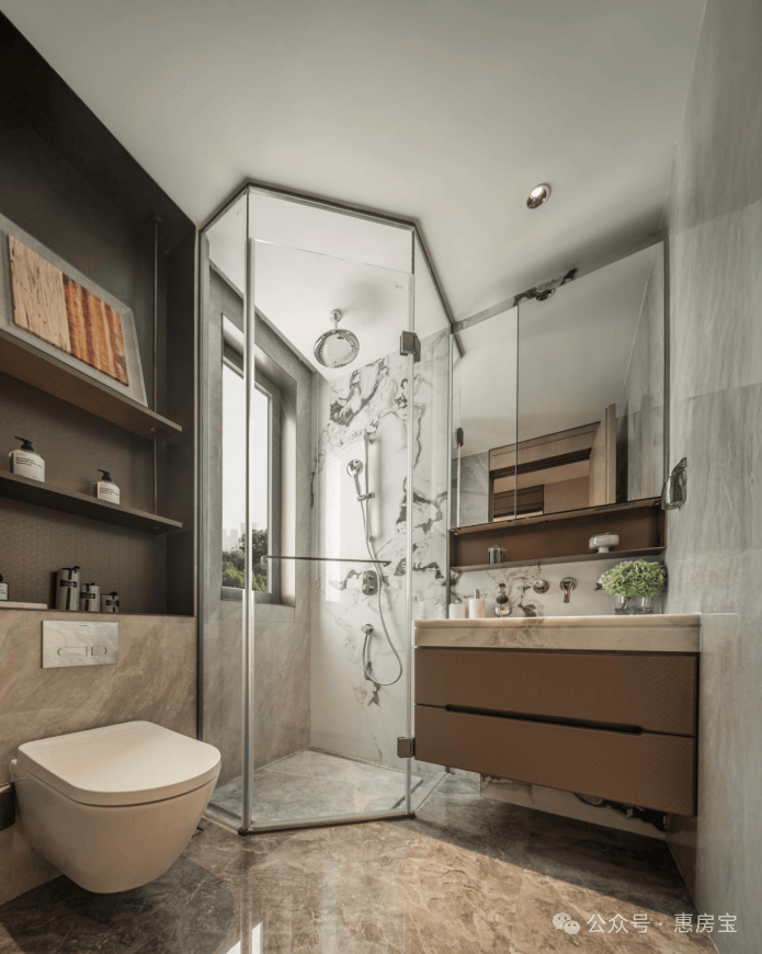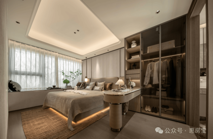 有一个细节大家可以在实地看样板间时留意:交付的内嵌式冰箱面板也是采用了木饰面,高级感扑面而来!吊顶和墙面采用大量弧线造型取代冰冷的直角,不仅以柔和的轮廓减少了磕碰隐患,更给空间注入了优雅与流动的气息甚至连主卧内卫生间墙面都做了弧线收边,精致感无处不在。地面通铺的大面积地砖,在弧线元素呼应下,延伸出很强的开阔感!