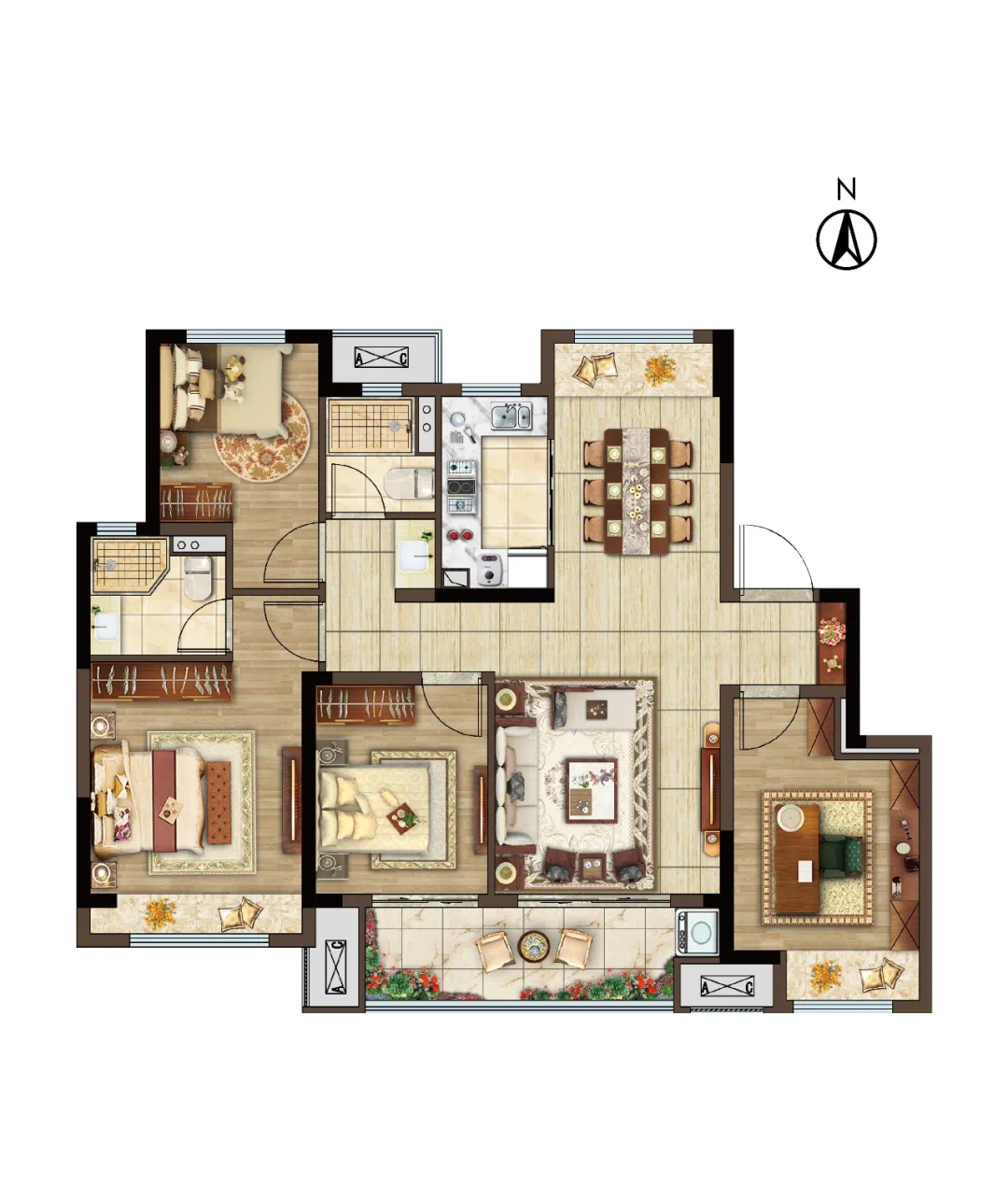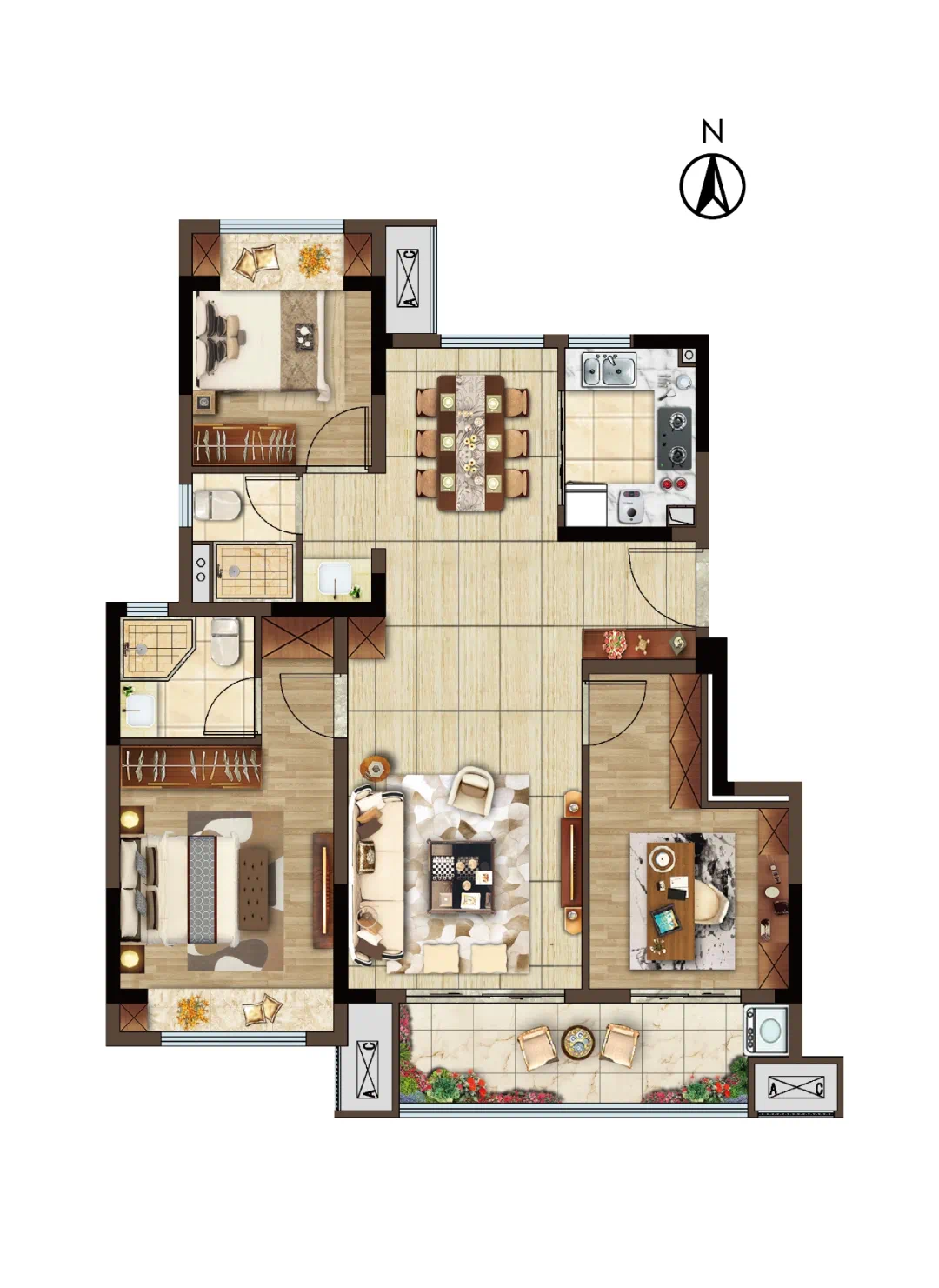 约101㎡,为项目最小的户型面积,是三房两厅两卫的格局,整体三开间朝南,南北通透;双联阳台,增加了采光面,南向主卧套房设计,还带有飘窗,居住舒适度、私密性都很高,北向卧室也自带飘窗,额外增加了使用面积。U型厨房,让洗、切、烹更为流畅。