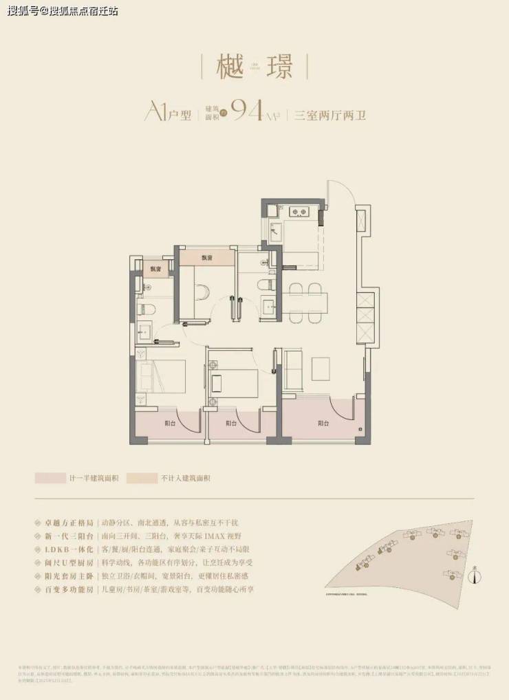 大华望樾建面约94㎡高层户型居然做到了三阳台的配置,远远超过新规标准。