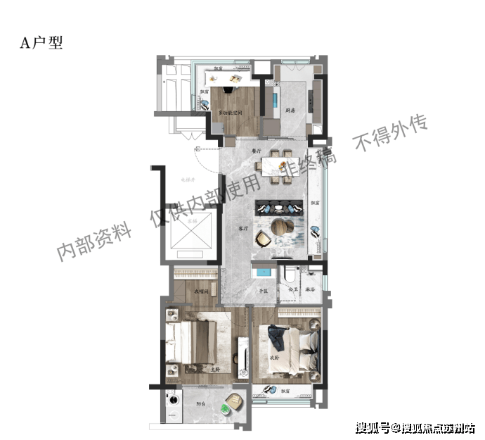 建面约121㎡的F户型,拥有三开间朝南奢阔横厅,公区客餐厅一体化设计,整个南向采光面足以媲美建面约130㎡以上的改善大户型!
