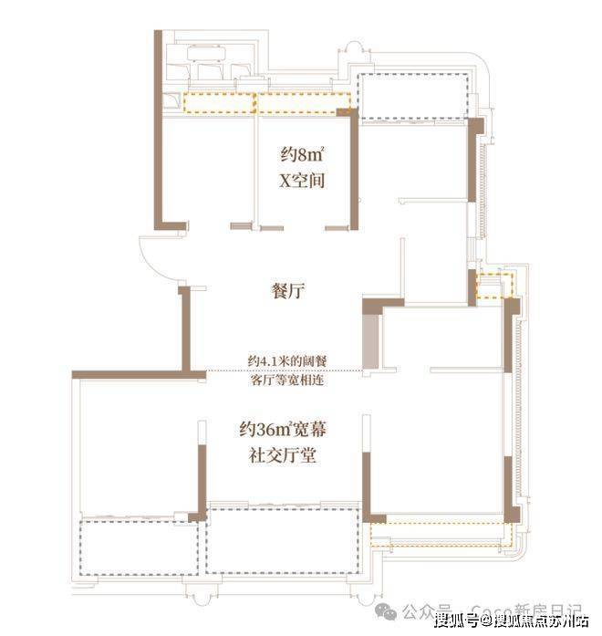 用三厅一体的空间场景设计,重塑生活体验,实现会“长大”的家。约36㎡宽幕社交厅堂,其中,约4.1米的阔餐客厅等宽相连,罕见的容纳6人圆桌,装得下两胎三代家庭的幸福温馨;创造性设计约8㎡的X空间,与客厅、餐厅实现三厅无界交融,带来更好的通风和采光效果。