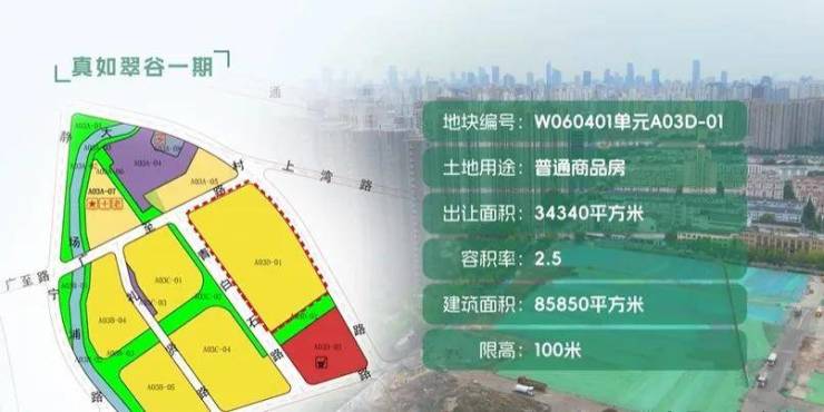 A03D-01地块:出让土地面积34340平方米,土地用途为普通商品房,规划容积率2.5,计容建筑面积85850平方米;