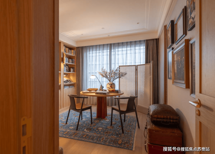 多功能书架彰显着设计的巧思,形成有如博物馆般的展示方式,即可放置日常读物,亦可展示珍本藏书。同时,利用屏风做隔断,与圆桌结合形成私密空间。