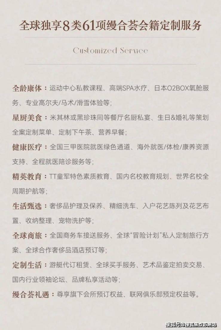 有社交、商务、运动、志趣、亲子5大主题,涵盖精致私宴、恒温泳池、健身房、儿童培训、风雅茶室、多功能厅等,并链接8类61项全球顶级资源,从运动、教育、旅行、医疗等多维度,成就与世界的共叙、与时代的共鸣。