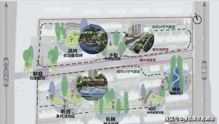 南北区:共计约1500M,与儿童活动、老年乐园、中青年健身平台、阳光草坪、休闲交流等贯穿,加之24节气,形成不同的功能体验。