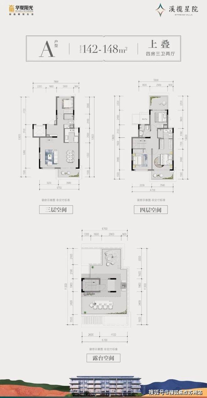建面约142~148㎡上叠:约6.7m餐客连厅/豪华主卧套房/顶层景观阳台/U型厨房