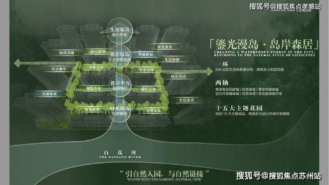 整个社区内,项目规划“一环两轴十五园”景观布局,将水岸、岛屿、森林、花园、树屋作为园林节点,营造出沉浸式山水活力场域。