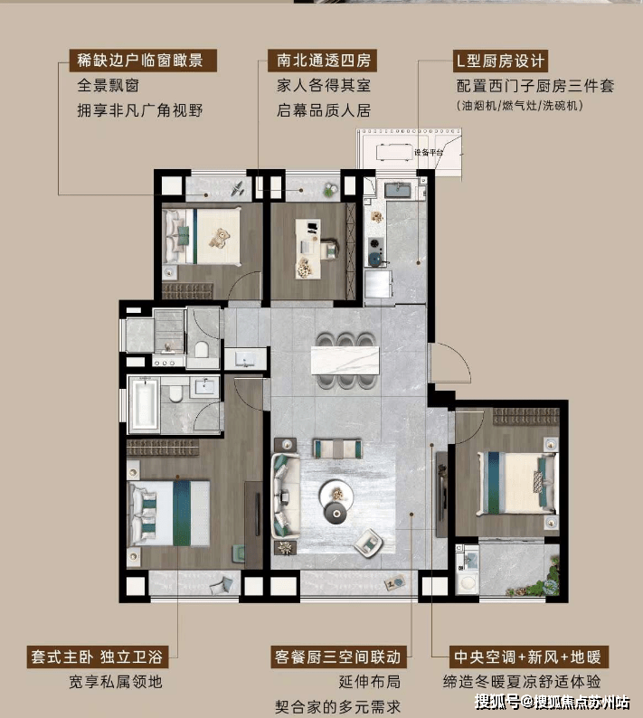 南向约5.95m大尺度客厅,采光面巨大,通透又明亮;方正四房规制四卧飘窗,引风景入室。餐客厅一体,南向联通阳台,家庭生活从容舒适;L型厨房,动线流畅;主卧套房配置独立卫浴、衣帽间,给足主人排场。