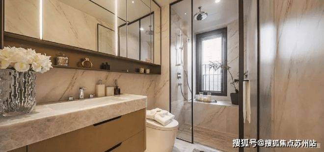 另外,淋浴间做移门隔断;墙面做壁龛工艺(用古铜金属材质),方便收纳洗漱用品;镜柜设置可活动层板,预留抽纸口、插座,镜面也做了补光,同时为爱美妆的主人预留了收纳口红、刷子、饰品等的格子, 处处高定细节。