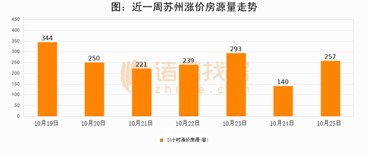根据诸葛找房数据显示,苏州24小时涨价房源量为257套,较10月24日增加117套,环比上涨83.6%。与此同时,涨价房源占比小幅扩大,业主信心有所提升。