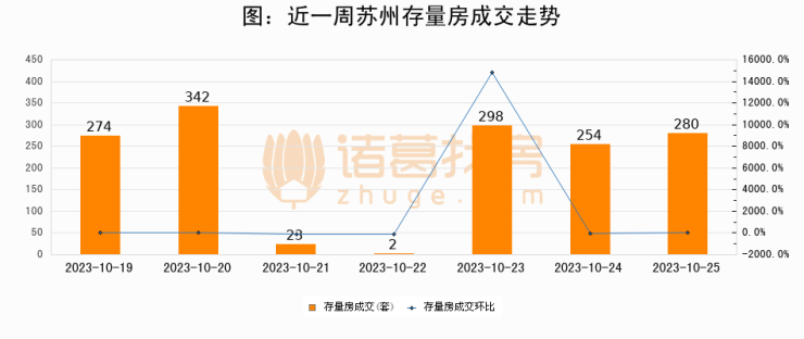 从存量房来看,2023年10月25日苏州存量房单日成交280套,比昨日增加26套,环比上涨10.2%。从近一周存量房成交来看,苏州存量房日均成交套数为210套,10月25日单日成交280套,高于近一周平均水平33.3%。