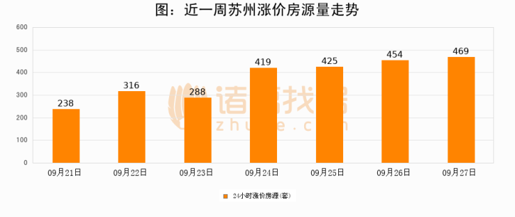 根据诸葛找房数据显示,苏州24小时涨价房源量为469套,较09月26日增加15套,环比上涨3.3%。与此同时,涨价房源占比小幅扩大,业主信心有所提升。