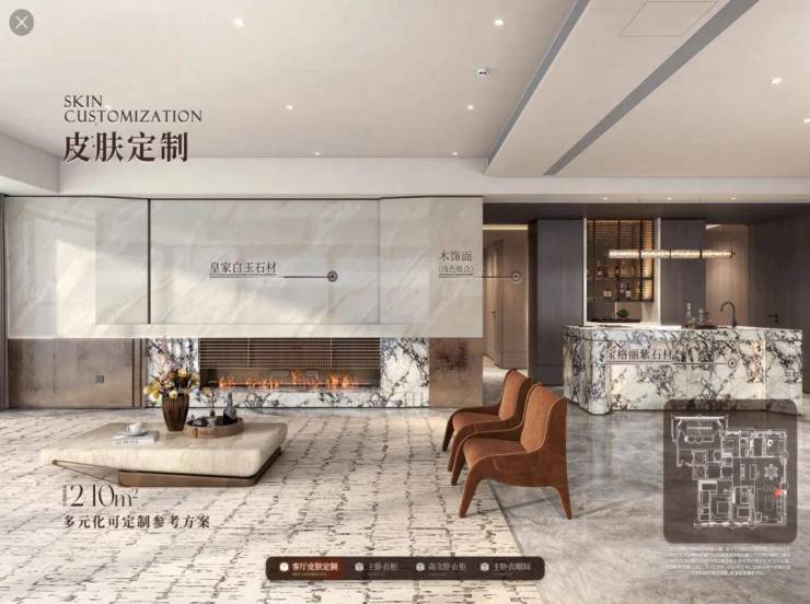 比如皮肤定制,墙面、地面、全屋柜门均提供多材质、多配色可选,客厅背景墙、岛台亦有多种石材方案自由搭配;