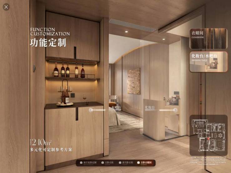 甚至还有功能定制,以240㎡主卧衣帽间为例,提供整体收纳、化妆台、水吧台等多种布局,精准贴合个人生活习惯。