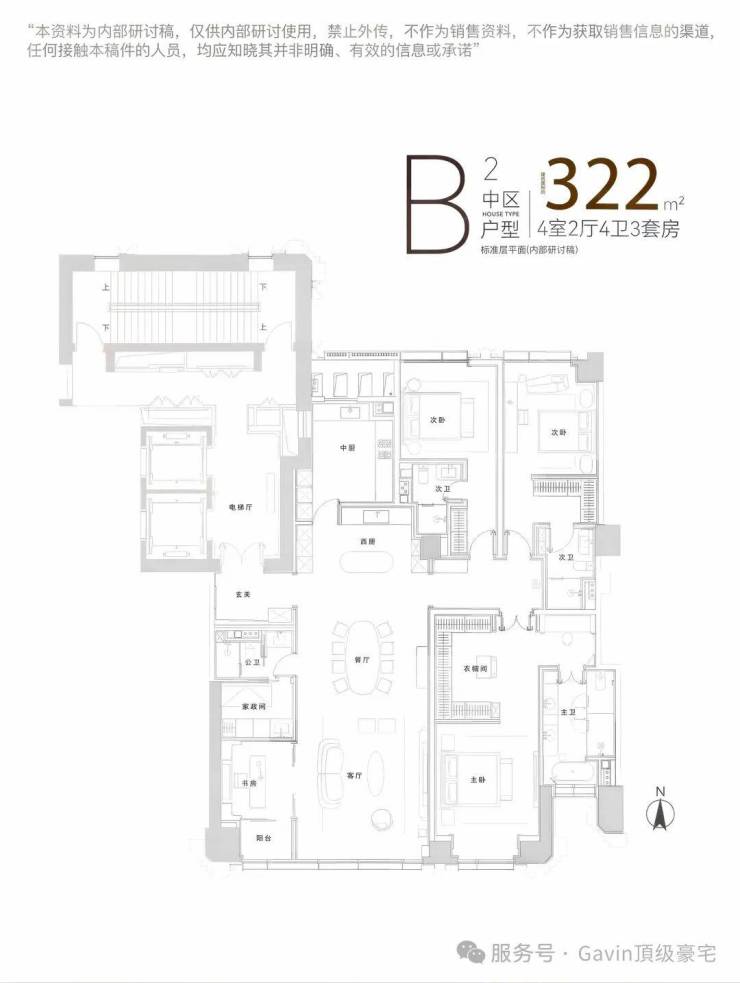 ·B·建面约317㎡-318㎡-322㎡,奢阔四室户型,LDKB+X一体通透化设计,公共空间阔绰通透,每间卧室都是套房设计,书房可灵活改造为茶室、健身房,满足多元场景.