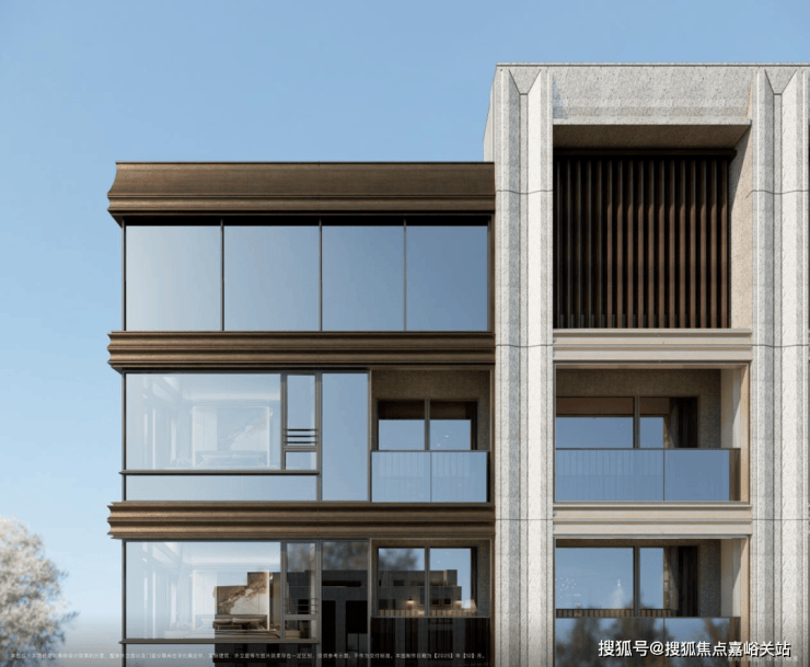 其次,产品配置拉满。1、石材+铝板外立面,普陀新的颜值标杆项目可视面都是古铜色金属铝板、米黄色铝板/石材、边套270°大转角飘窗,且从正面、侧面到背面,立面都保持精致统一。