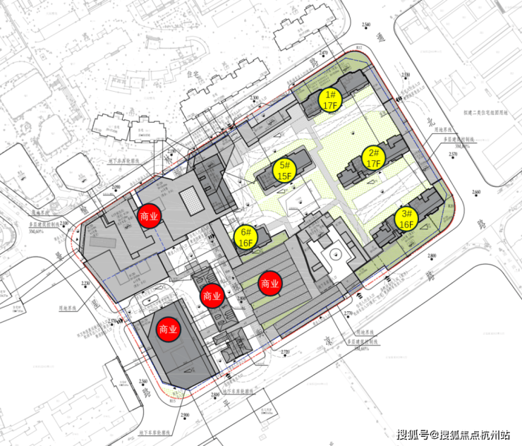 根据设计方案显示,地块拟建5幢15~17F高层住宅及大规模商业建筑。
