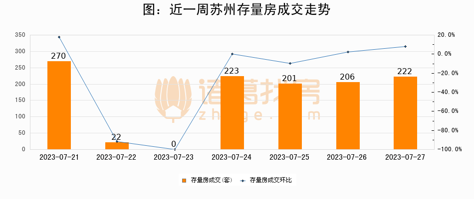 从存量房来看,2023年07月27日苏州存量房单日成交222套,比昨日增加16套,环比上涨7.8%。从近一周存量房成交来看,苏州存量房日均成交套数为163套,07月27日单日成交222套,高于近一周平均水平36.2%。