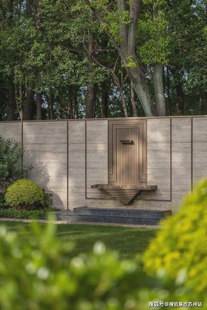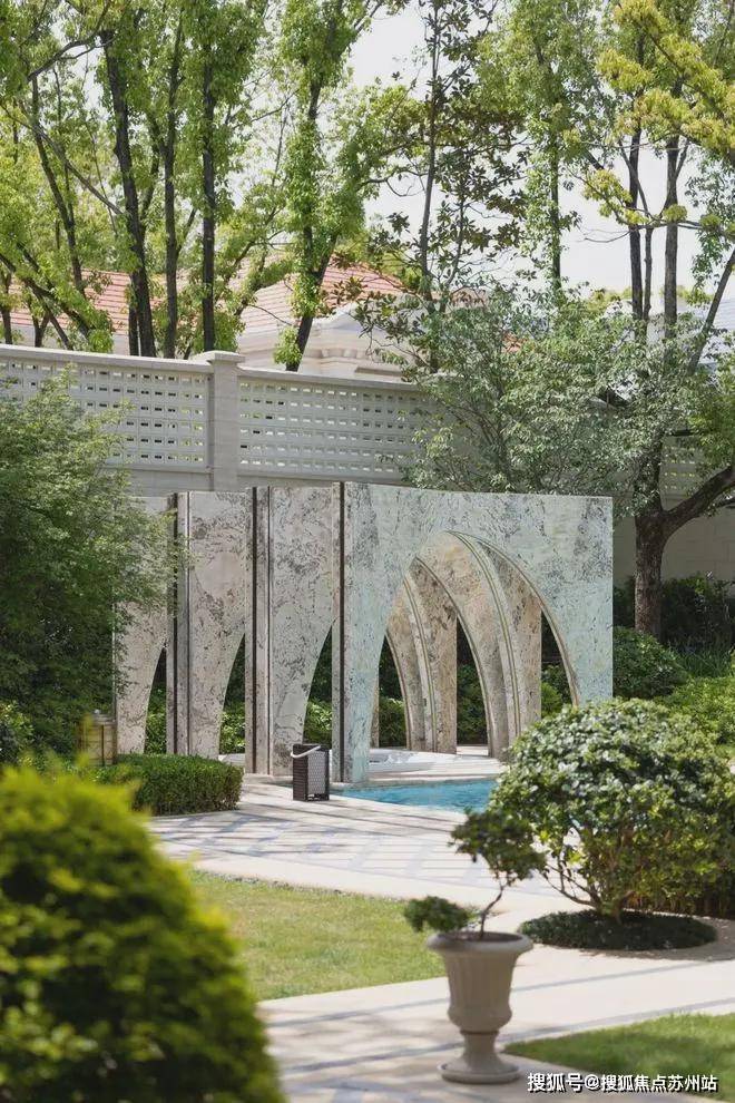 修剪如雕塑的灌木阵列静立四周,