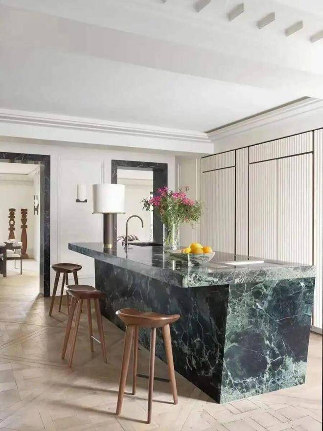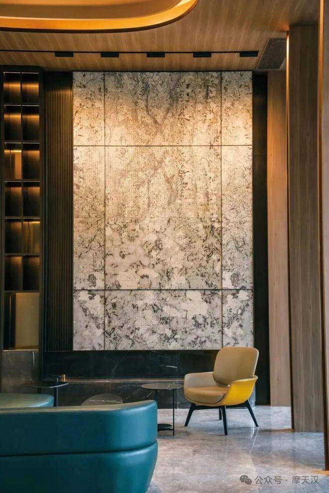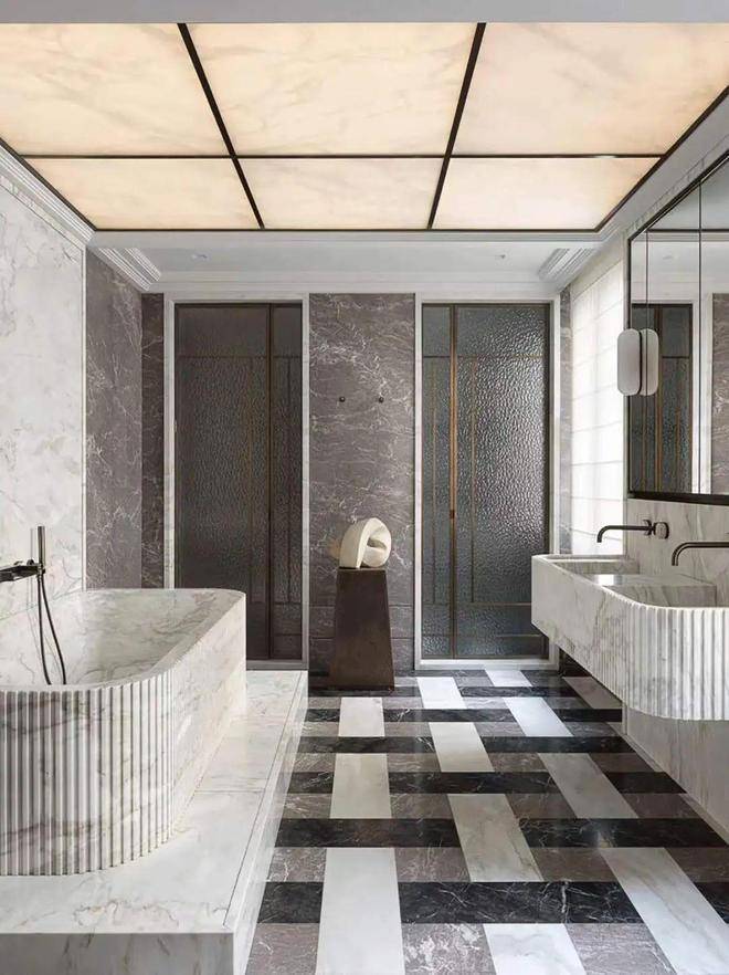 The floor is fully covered with fishbone parquet wood flooring. The beige woven wall fabric is paired with a starry sky pattern imitating metallic paint, which is exquisite and mysterious. Under the 13-meter-deep skylight floor-to-ceiling Windows, even the most picky ones have no temper.