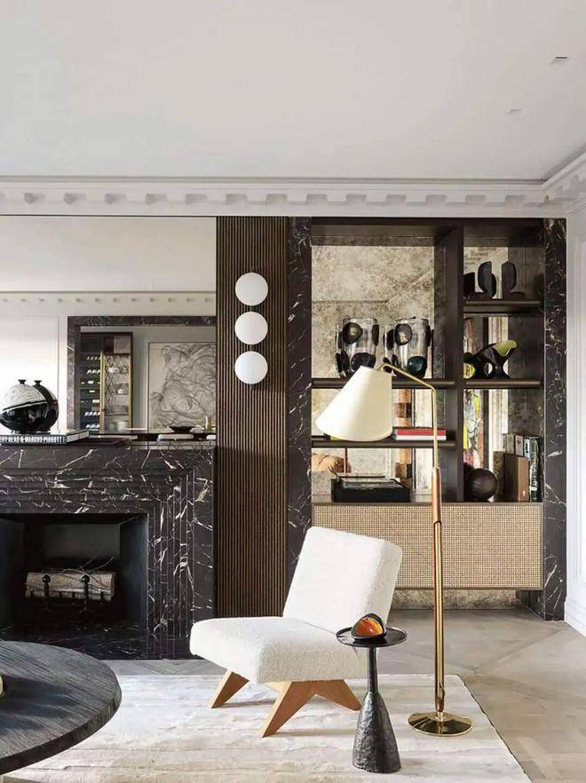 梅维拉的雾化壁炉前是一对单体沙发,既是端景也是空间最好的分割线,一边是家人闲坐,一边是会客品茗。