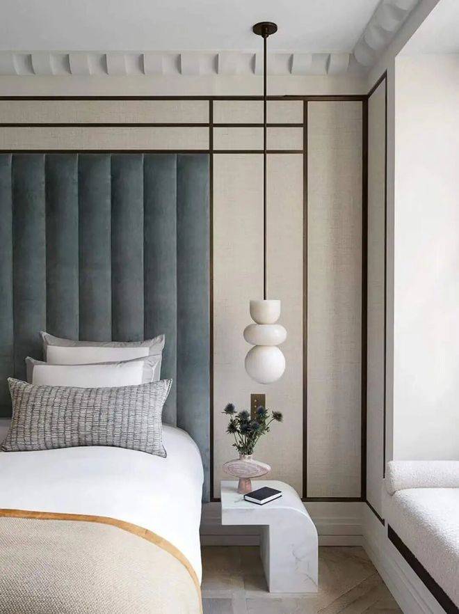 三个卧室都朝南,做了三套房,推开双开门进入主卧,背景墙是蓝绿米黄的墙布和皮革软包,折叠门拉在一边,是一个内包阳台,坐在软榻上看窗外的城隍阁,山峦供白云以家乡,使之倦游而归息。