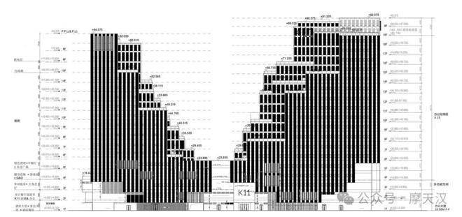 K11 ART MALL楼高9层,总建筑高度60.55米。K11 ARTUS效果图K11 ARTUS楼高18层,总建筑高度74.80米。把“龙井梯田”的理念融入建筑,以立体园林的巧思,两座塔楼随着高度增加逐层后退,在退层中种满绿色植物营造出空中花园。而塔楼之间在底层形成“城市峡谷”,这里是一个公共的开放式互动空间。这两座塔楼亦是整个项目制高点,瑰丽酒店规划了17层,K11 ATELIER规划了20层,最高建筑高度92.075米。不同地块之间以天桥或商业连廊的形式进行互联,就像杭州丝绸般丝滑与柔顺,新世界中国称之为“杭蕴绸带”,通过“杭蕴绸带”将K11 ART MALL、K11 ARTUS、K11 ATELIER、ROSEWOOD、国际社区“江明月朗园”五大顶级业态被丝滑串联起来。