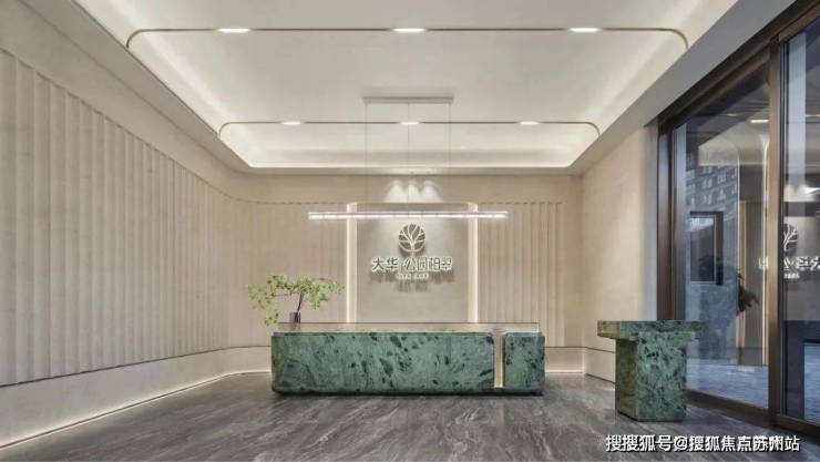 内墙材料选用来自 保加利亚的维纳多石材 ,整块 大理石圆弧拉槽 ,这是顶级豪宅才有的用料和细节。 大堂接待台选用产自 意大利山脉的宝格绿奢石 一体打造而成。 这些用料和最终呈现出来的浓郁海派氛围,是对大华集团实力和匠心最好的体现。