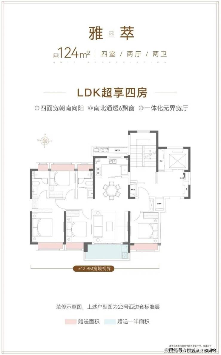 来看看更大一点的户型——建面约124㎡四房,同样是飞机户型设计,并拉伸至4开间,南向整体约12.8米面宽,空间感和舒适度拿捏到位。