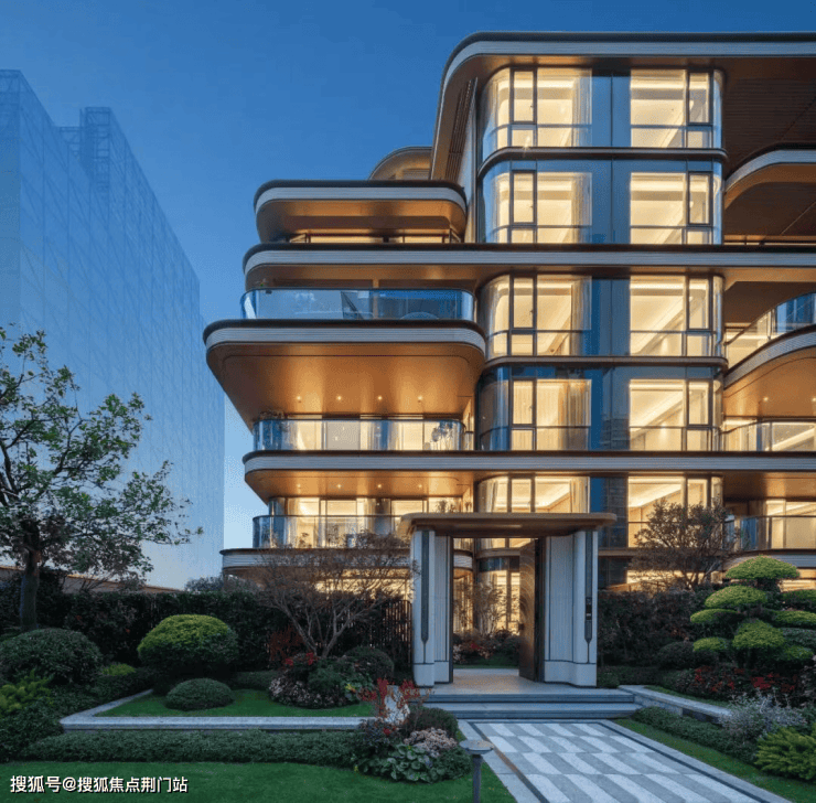 天澜传序府的外立面,用古铜金的铝板、「全面屏」般的大幅玻璃,还有钱塘江潮般的弧形曲线,搭配出了超强的精致度。这样的叠墅颜值,放在今年的杭州,都首屈一指。