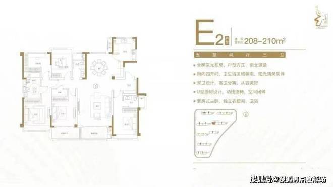 建面约208-210㎡五室两厅三卫户型特点:全明采光布局,户型方正,南北通透;南向四开间,主生活区域朝南,阳光清风常伴;双卫设计,客卫分离,从容美好;U型厨房设计,动线流畅,空间阔绰;套房式主卧,独立衣帽间、卫浴。