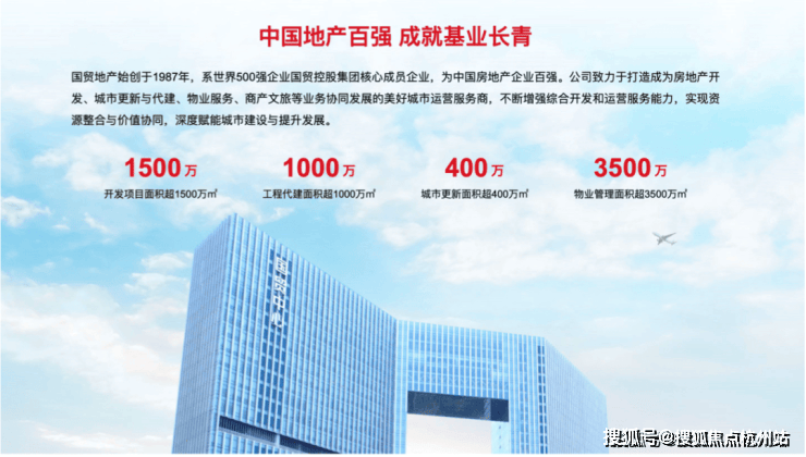 旗下的国贸地产,为国贸股份全资子公司,始创于1987年,连续9年荣获“中国房地产开发企业100强”、连续3年获得“中国房地产开发企业运营效率10强”和“中国房地产开发企业品牌价值华东10强”,拥有“金钥匙”品牌商标。